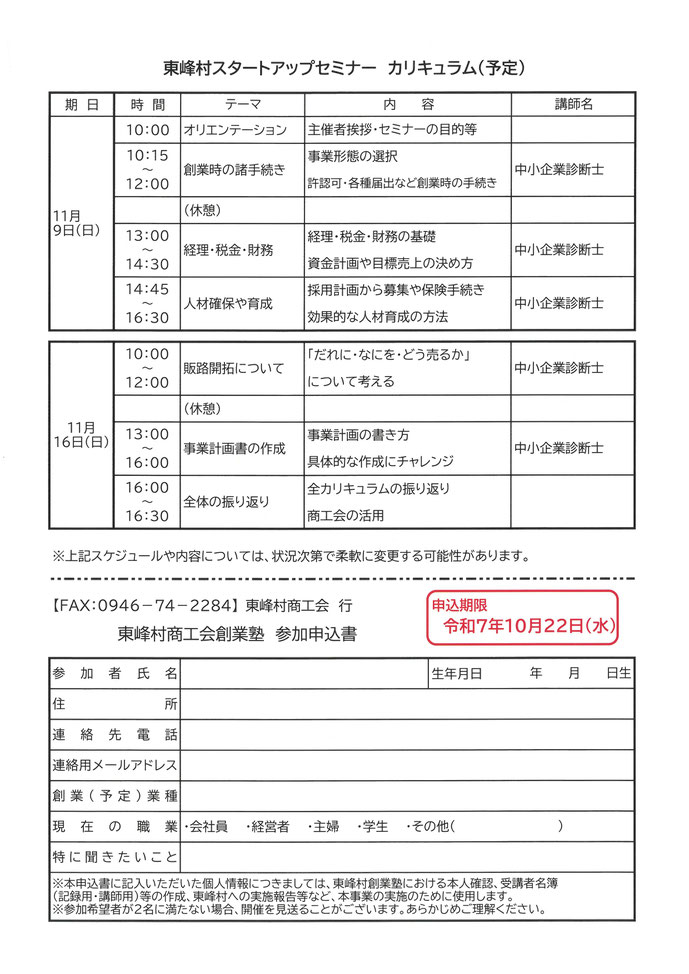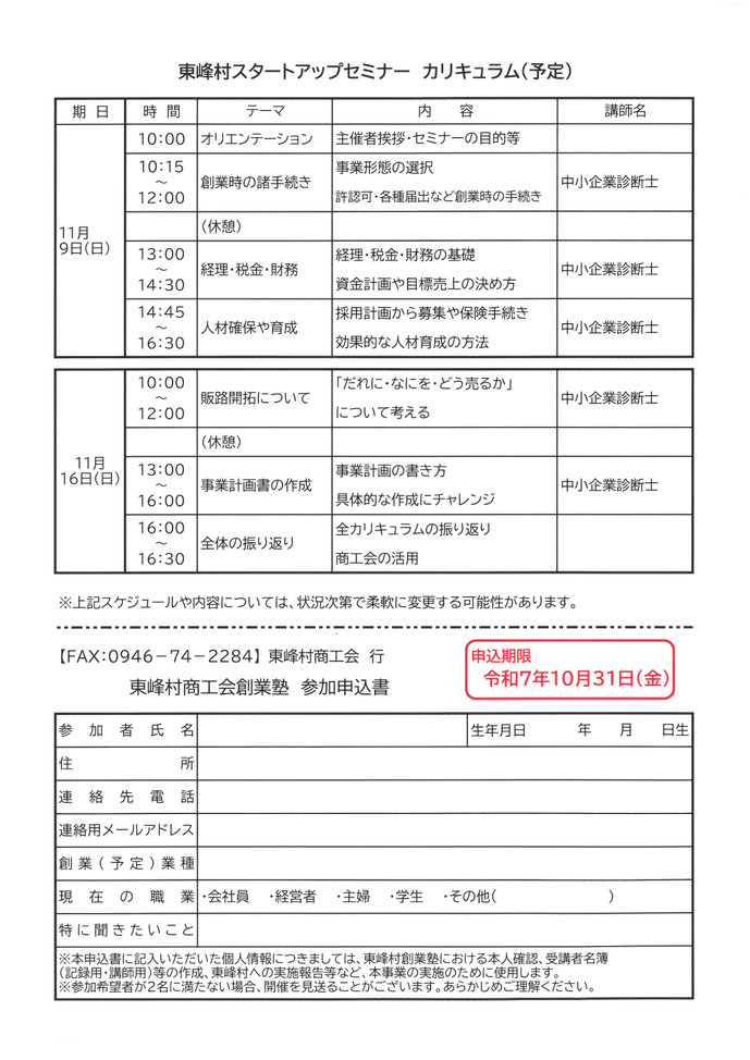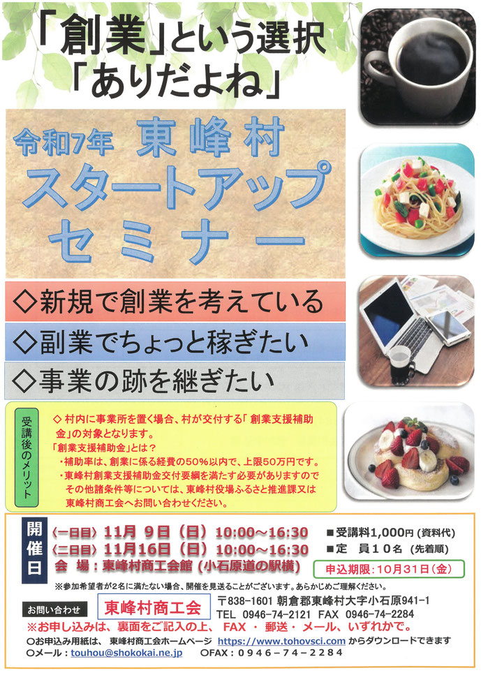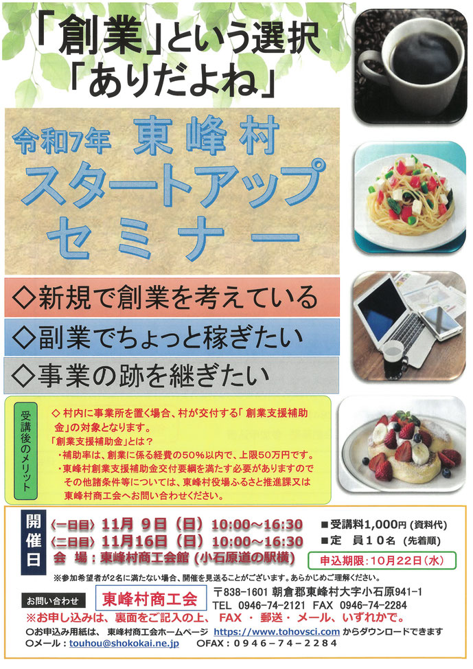 東峰村商工会にて11月9日(日)・16日(日)にスタートアップセミナーを開催いたします。詳しくは下記のお知らせをご覧ください。