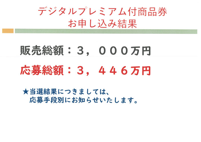 8月2日(消印有効)まで受付を行っておりました商品券ですが販売金額以上の申込をいただきましたので抽選となりました。抽選結果は返信用のハガキをもってお知らせいたします。