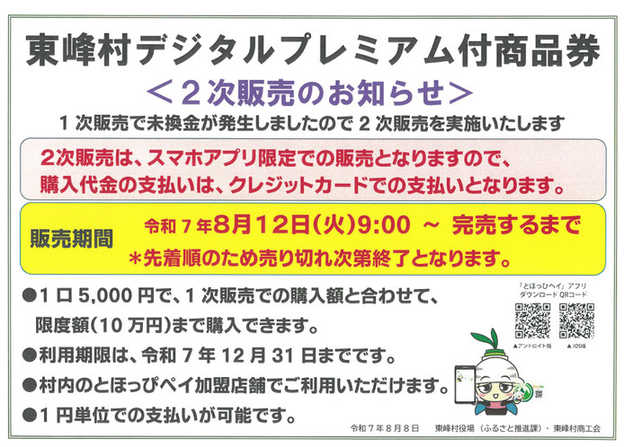 8月9日よりデジタルプレミアム付商品券の2次販売をとほっぴペイのアプリでのみ行っております。詳しくは下記のチラシをご覧ください。